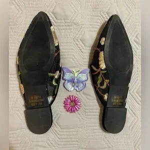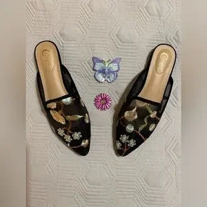 Step out in style with these chic black embroidered mules. Perfect to wear with pants or dresses.