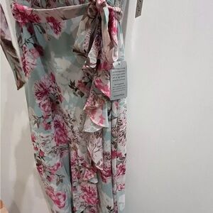 Elegant wrap dress with floral pattern. Features pink and blue hues. Perfect for any occasion.