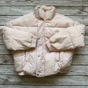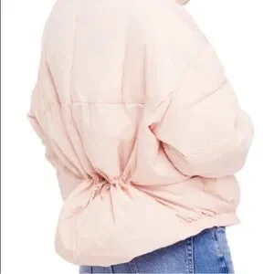 Stylish puffer jacket by Free People. Soft pink color. Features snap buttons and ribbed cuffs.