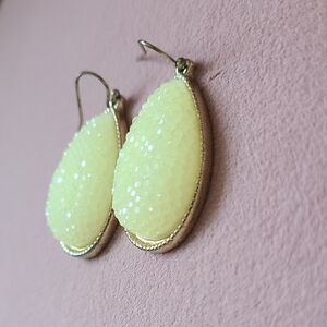 Teardrop shaped, textured, and 3D, has a sparkle, cream/off-white color