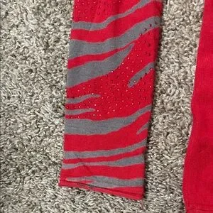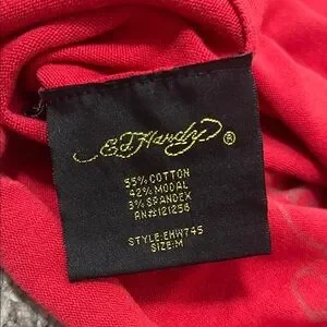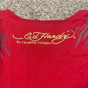 I love this top! Sadly, it no longer fits me. Good pre-loved condition. Vintage Ed Hardy. Vibrant red top with gray striped sleeves. Features bold skull design with rhinestone bling and touches of gold . Ideal for making a statement.