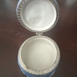Blue ceramic with white angel & floral details; silver rim & butterfly closure; good condition; detailing and measurements in pics;