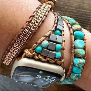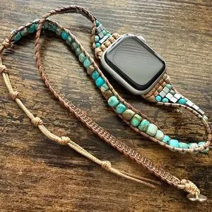 Give your Apple Watch an upgrade with this unique Boho Turquoise Natural Stone Apple Watch Strap. This boho watch band is hand sewn with real multi-size gemstones which includes a beautiful statement piece.