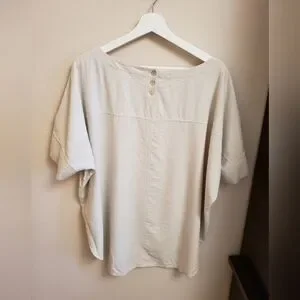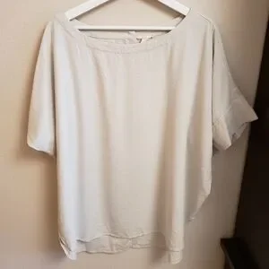 Beautiful raw silk textured top in color Bone. Curved hem with a dolman style and cuff look sleeve detail. A slight high low hem. Only worn once, brand new condition. Aprox 32" pit to pit, shoulder to bottom hem 29".