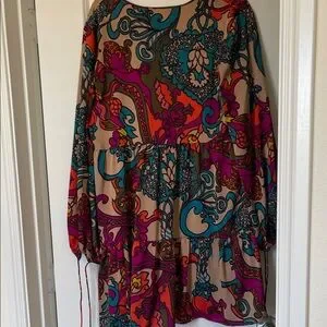 Colorful mini dress with bold patterns. Features long sleeves and a playful design. Perfect for a standout look.