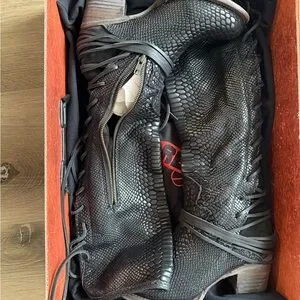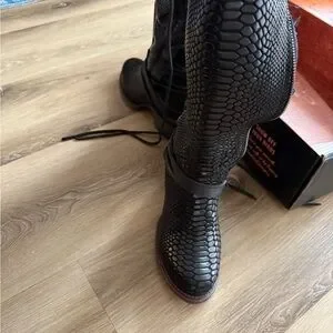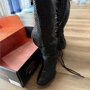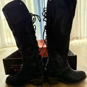 Stylish lace-up boots with textured design. Features side zipper for easy wear. Perfect for a bold look. Size sold out online, excellent used condition!