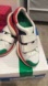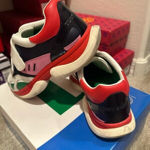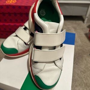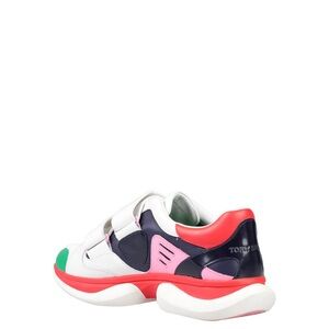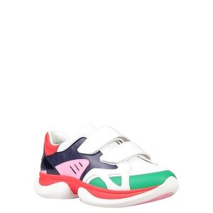 Bold sneakers with a mix of white, pink, green, and navy. Velcro straps for easy wear. Stylish and sporty design.