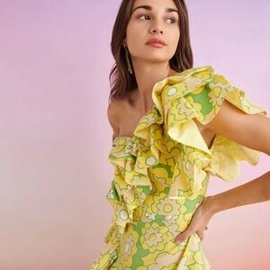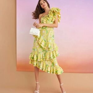 Asymmetric one sleeve printed yellow and green dress. The ruffles along the design make it playful and sophisticated at the same time. It's Midi Length Makes It Perfect For A Summer Wedding.