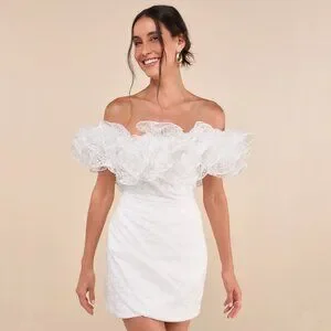 Steal everyone's attention with your heavenly energy in the Lulus Angelic Trend White Embroidered Ruffled One-Shoulder Mini Dress! Airy woven organza, with floral-like embroidery throughout, shapes this eye-catching dress with a one-shoulder neckline adorned with a structured, oversized ruffled trim that flows into an elasticized, off-the-shoulder strap. The princess-seamed bodice has a high, fitted waist that tops a figure-skimming mini skirt with an overlapping, tulip silhouette. Hidden back zipper/clasp.