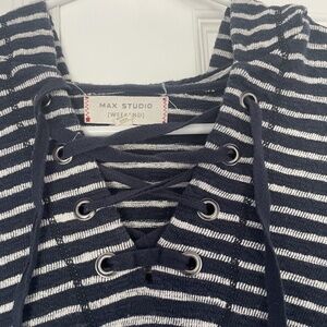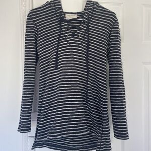 High End hoodie, casual, weekend wear. Navy and white striped, comfortable but high end comfort wear