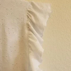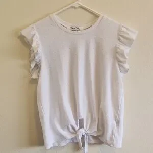 Has ruffled sleeves and a tie at the bottom. So cute. Perfect with a skirt or shorts!