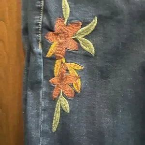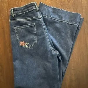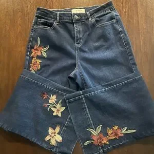 Chic wide-leg jeans with floral embroidery. Perfect for casual style. 30” inseam.