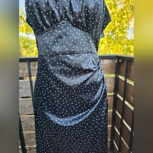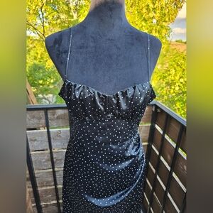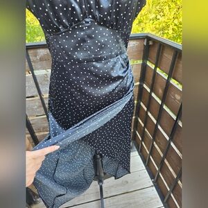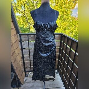 Chic fold over dress with polka dots. Features a stylish slit, spaghetti straps and open back . Perfect for any occasion.