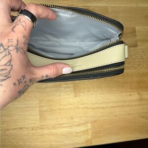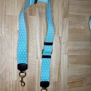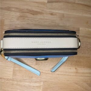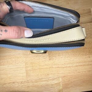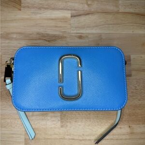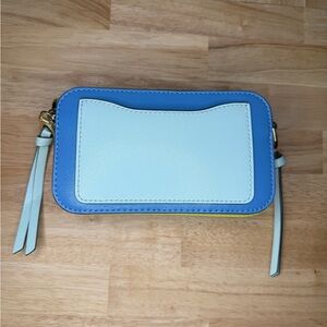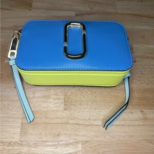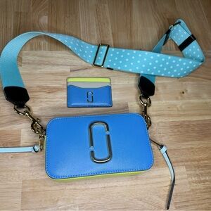 Stylish Blue & Neon Green Marc Jacobs Snapshot crossbody bag. Comes with a matching cardholder. Features a polka dot strap.
