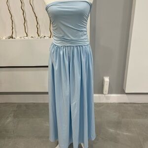 Chic strapless maxi dress in a soft light blue. Perfect for formal occasions.