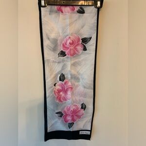 Elegant scarf with pink floral design. Features black border and white background.