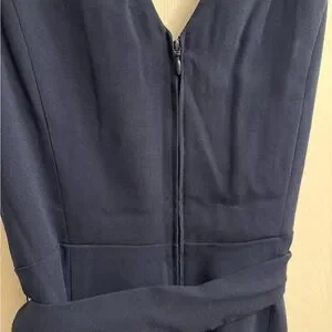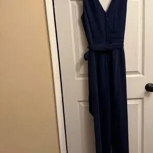 Stylish navy blue jumpsuit with a V-neck design and tie. Perfect for any occasion.