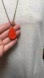 13” gold metal chain with a lobster clasp with a 2” long/1” wide teardrop shaped bright orange druzy pendant.