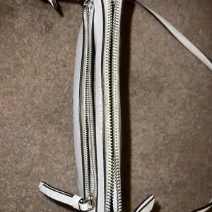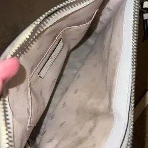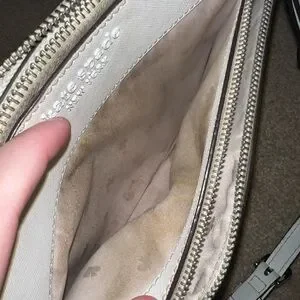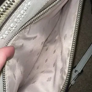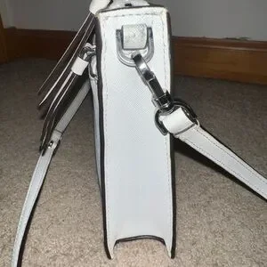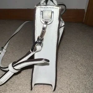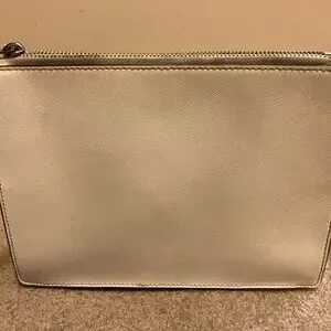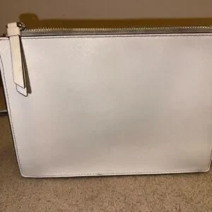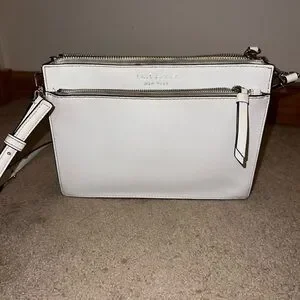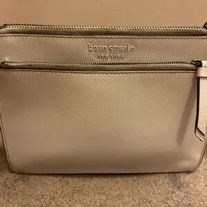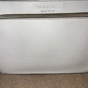 Chic ivory shoulder bag by Kate Spade. Features a front zip pocket. “major discoloration near the zippers, needs a good clean* *some staining inside the big and smaller pockets* *some small darker spots on leather, black lining on bottom corners is worn off* HAVENT ATTEMPTED TO CLEAN, MAY COME RIGHT OFF. See pics before buying 9.5” length and 7” height