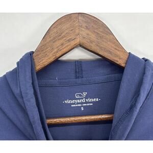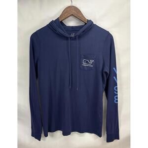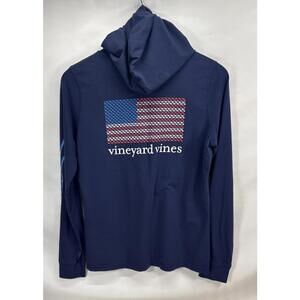 The product is a men's small hooded pullover sweatshirt by Vineyard Vines, featuring a solid navy color with a flag and whale logo accents. Made of cotton knit fabric, this sweatshirt has long sleeves, a drawstring closure, and is machine washable. The regular fit and pullover style make it a comfortable and stylish choice for the winter, fall, and spring seasons. Perfect for adding a touch of casual sophistication to any outfit.