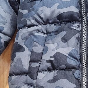 Stylish camouflage puffer jacke features a zip-up front, 2 side pockets, and a hood.