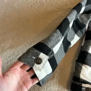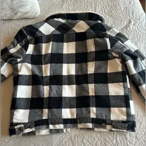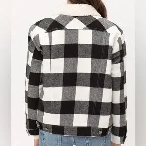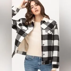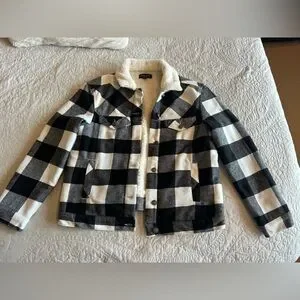 Cozy and warm faux fur/sherpa lining, classic buffalo plaid pattern in [e.g., black and white], button-front closure, two chest flap pockets with buttons, two side utility pockets. Versatile "shacket" style can be worn as a jacket or a heavy shirt.