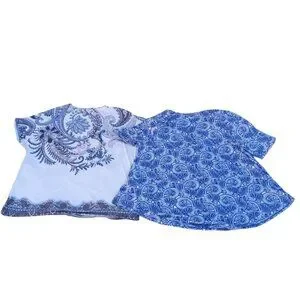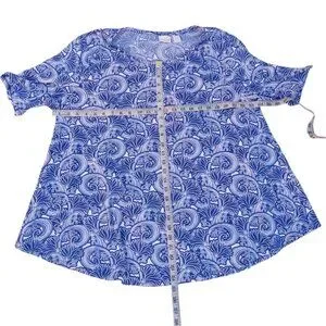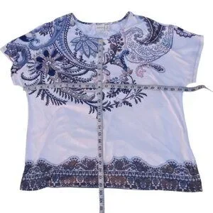 In good preowned condition. Blue and white knit top has flared bottom. Zenergy by Chico's: cream and blue top tee has sequin decor. Made of polyester/spandex blend. Measurements in photos. Measures: armpit to armpit 24". SEE CHICO'S SIZE CHART. COMPARE YOUR MEASUREMENTS BEFORE PURCHASE. From a smoke free and cat/dog friendly home. #(15)