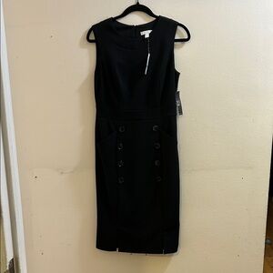 Chic black midi dress with stylish button accents. Sleeveless design for versatile wear. Perfect for any occasion. Has pockets!