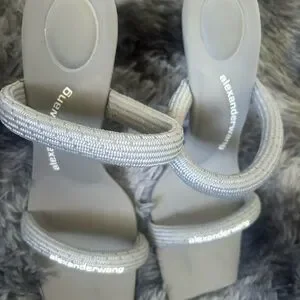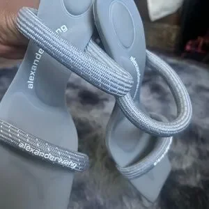Chic metallic gray heels by Alexander Wang. Features elegant strappy design.
