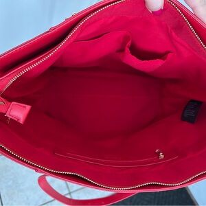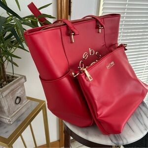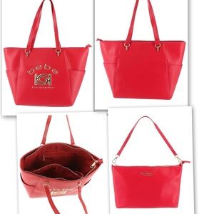 Stylish and spacious, the Bebe Red Tote and Pouch Set is perfect for any occasion. Featuring a vibrant red color, this set adds a pop of color to your outfit. The tote offers ample space, while the matching pouch keeps your essentials organized. Elevate your style with this chic Bebe accessory.