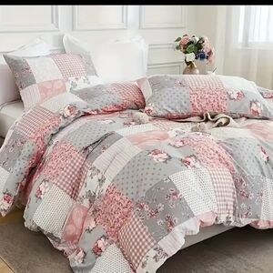 Brand new still in bag, never even opened the bag up. Enhance your bedroom with this charming patchwork floral duvet set with 2 pillow cases. Featuring a delightful mix of pink and gray tones, this set adds a touch of elegance and comfort to your space. Perfect for creating a cozy and inviting atmosphere. Size is 264*229 cm which is a king.