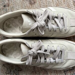 Classic Adidas Samba sneakers in cream. Sleek design with signature stripes. Ideal for casual wear.