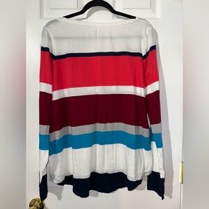 Chic blouse with bold stripes. Features red, blue, and white hues. Ideal for casual wear.