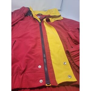 The Vintage 90's Tommy Hilfiger Hooded Jacket in red and blue is a classic men's XL size windbreaker featuring the iconic spellout logo on the hood. Made of nylon with a polyester insulation, this jacket is perfect for the winter, fall, and spring seasons. With a zip, button, and snap closure, this jacket is not only stylish but also practical for activities like walking, golf, and hiking. The retro 90s theme and Tommy Hilfiger branding make this jacket a standout piece for any wardrobe.