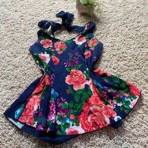 Medium, adorable floral tied up outing shirt. Pompeii ish style but super tight around hips, perfect for leggings. See through back 🌻