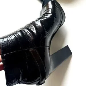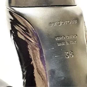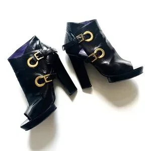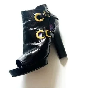 Sergio Rossi Crinkle Patent Leather Open-toe Booties Golden Statement Buckles 38. EUC. Fabulous with wide denim, mini or maxi-skirts, or festive wear. While these are open-toed, they look amazing in on point when worn with stockings or tights. Please see all photos for any wear and heel height. Small platform for comfort. All my items arrive clean and ready to wear. Bundle for combined shipping.