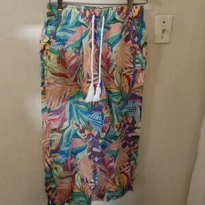 C&C California Linen Pants Sz S Tropical Floral Wide Leg Pull On orange blue