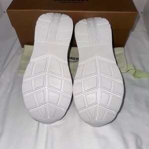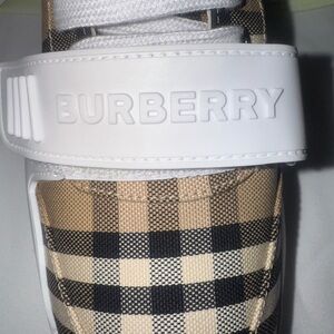 Stylish Burberry sneakers with iconic check pattern. Features beige and white colors. Comfortable and trendy design.