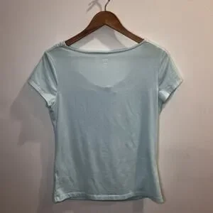 Title Nine Shirt Womens Medium Light Blue Breeze Cowl Neck Short Sleeve Stretch