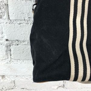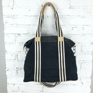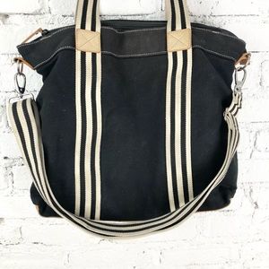 Stylish black bag with tan stripes. Features dual handles and adjustable strap. Perfect for everyday use.
