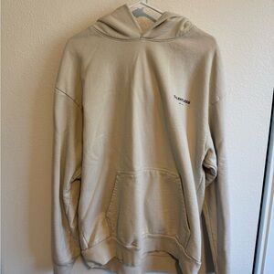 Classic cream hoodie with a relaxed fit. Features a cozy hood and front pocket.