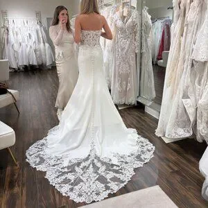 Absolutely stunning fit and flare new wedding dress. Strapless Crepe and Lace. Sample, never worn. Label size 14. Never altered. Beautiful lace embellished train.