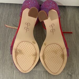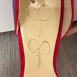 Elevate your look with these chic Jessica Simpson heels. Bold red and purple hues make a statement. Perfect for any stylish occasion.