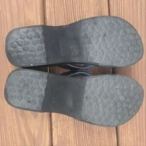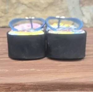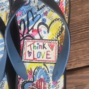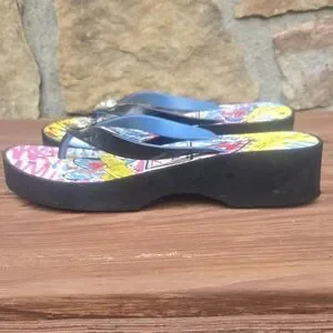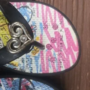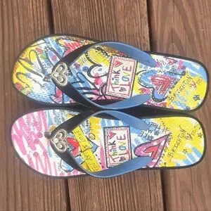 Vibrant sandals with artistic graffiti design. Features black straps and colorful patterns. Ideal for casual wear.