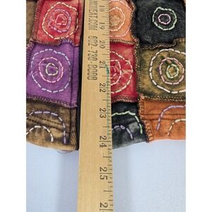 Features a unique patchwork and applique pattern on the front with colorful squares, circles, and artistic stitching for a boho festival vibe.