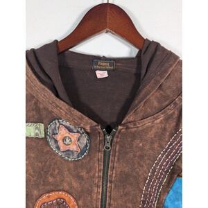Rising International Hoodie Jacket Womens Large Brown Patchwork Boho Festival Nepal Art