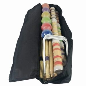 This beautiful outdoor Croquet Game is multi-colored and striped. Comes with a black, zippered carry bag.
