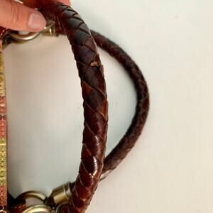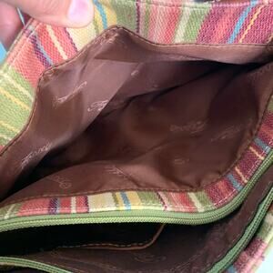 This Fossil purse is a must-have for fall! The striped canvas exterior in shades of yellow, green and red are complimented by the leather trim . The top handle and in made up of a unique braided leather that has a little bit of wear, show in photos. The top zipper opens up into a clean interior that is lined with brown signature fabric. The interior features zipper and slide pockets to keep your belongings organized. There are also additional slide pockets on either side of the top zipper for easy access to essentials. This medium-sized bag is perfect for everyday use -don't miss out on the chance to add this beautiful Fossil purse to your collection!