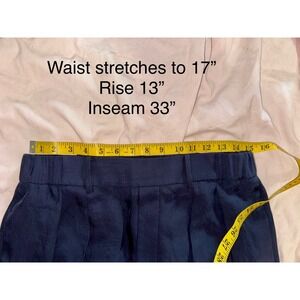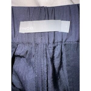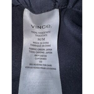 Vince navy blue trousers 100% Triacetate fabric. Elastic back waistband with belt loops and a pleated front. Fabric is from Japan but made in China. Beautiful pants or dress slacks. The approximate measurements are a relaxed waist of 15" that can stretch to 17". 13" rise and a 33" inseam. Excellent condition. Retail is $428.