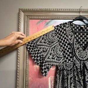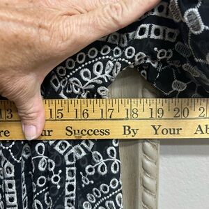 Bohemian black and white eyelet mini dress. Perfect for summer…. kimono like sleeves with contrasting trim edges… intricate hemline…v-neckline ..this is also a perfect beach cover up… this dress is unlined. Take advantage of the free shipping on this dress and bundle with other items and save.